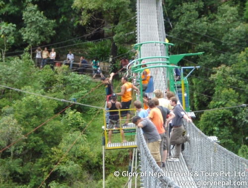 The Bridge : Swiss designed, specially for bungee jumping with a 4x safety factor. The bridge has a loading factor of 250kg per running meter. This means that the bridge will hold 250 x 166 = 41,500kg or 4.5 tones And those are Swiss measurements! * Over 6000 meters of steel wire was used to build the bridge * Longest suspension bridge in Nepal * The bridge joins two sides of a great valley. Before its construction, locals walked five hours to cross this river gorge